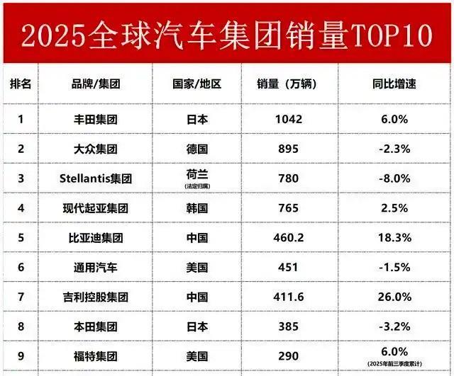 近日,全球各大汽车集团成绩单陆续揭晓,两家中国车企表现优秀:比亚迪以460.2万辆销量稳居全球第五,吉利首次突破400万辆大关,跻身全球第七。智电车讯认为,这预示着中国车企不再只是全球市场的参与者,而是已经成为重塑竞争格局的关键力量。